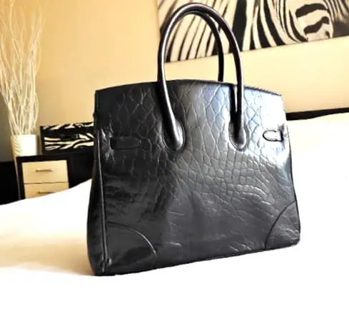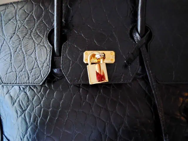 The everyday bag that travels with ease! The Black Croc Embossed Leather Tote is perfect for daily use with enough room for all of your overnight essentials. The sophisticated firm shelled barrel design with convenient flat bottom makes it a lovely companion for every day or a last minute getaway. Features a top locking zip closure, matching gold padlock and key, a flat bottom with gold studs, double handles, several interior pockets and a black fabric lining.