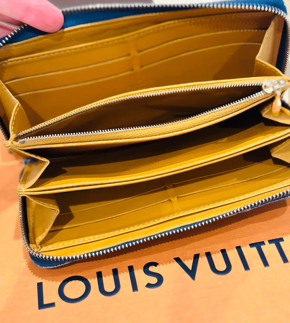 This practical and chic Louis Vuitton Monogram Blue Denim Zip Around Wallet – Clutch may sophisticated as an awesome grab and go organizer – clutch for all of your errands and appointments which can even fit an iPhone with a special touch of lovely brand! It has a 3/4 wrap around zipper that opens to a beautiful saffron leather interior with three open compartments, two with four card slots in each, a zipper pocket, a slot pocket and two side pockets.