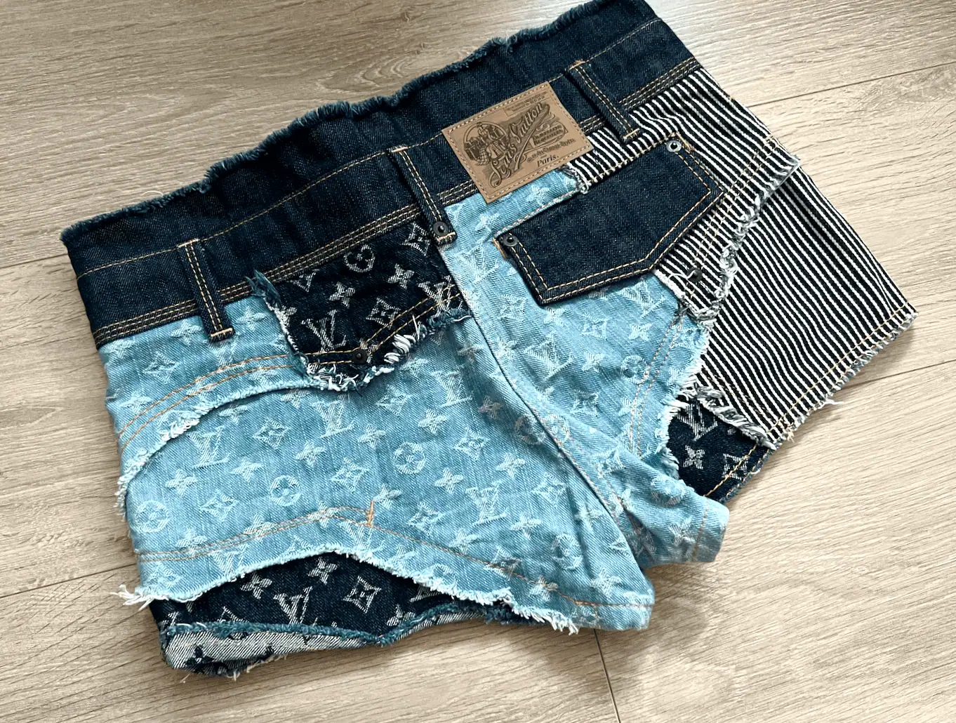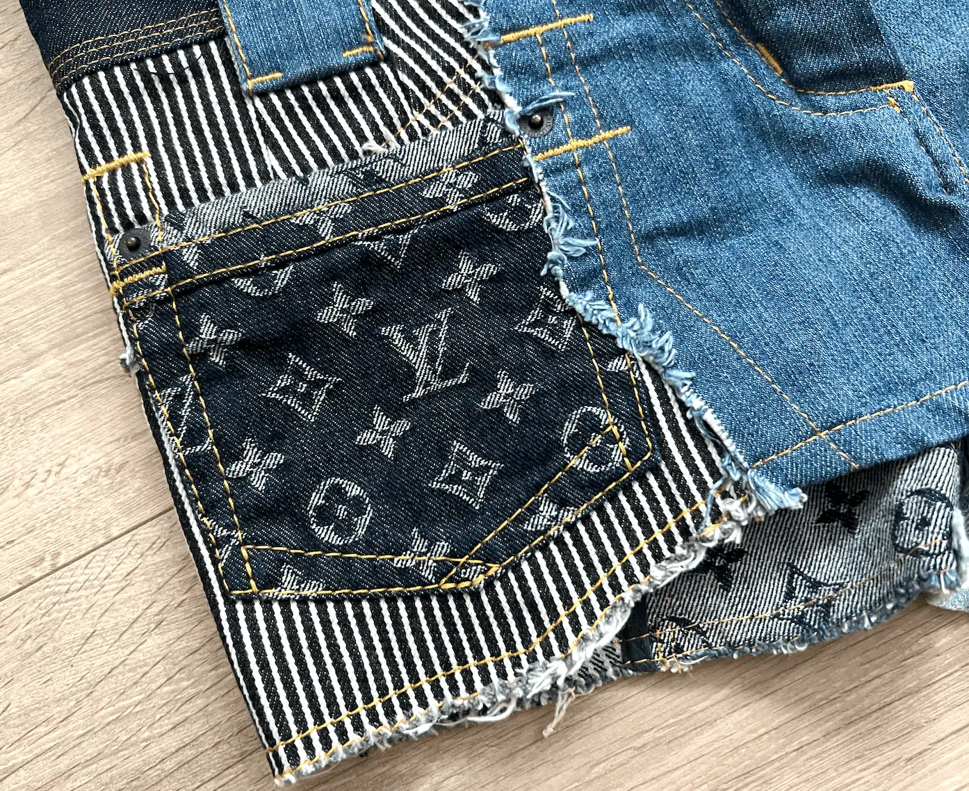 ABSOLUTELY STUNNING LOUIS VUITTON RARE PATCHWORK DENIM/JEAN SHORTS/SZ.38FR (US 6) FROM A BEAUTIFUL PATCHWORK COLLECTION, THESE SHORTS ARE CONSTRUCTED IN FULL DENIM TOGETHER WITH SEVERAL DIFFERENT PATTERNS. THE MONOGRAM MATERIAL IS FEATURED ON SOME OF THE PATCHES WITH STRIPES