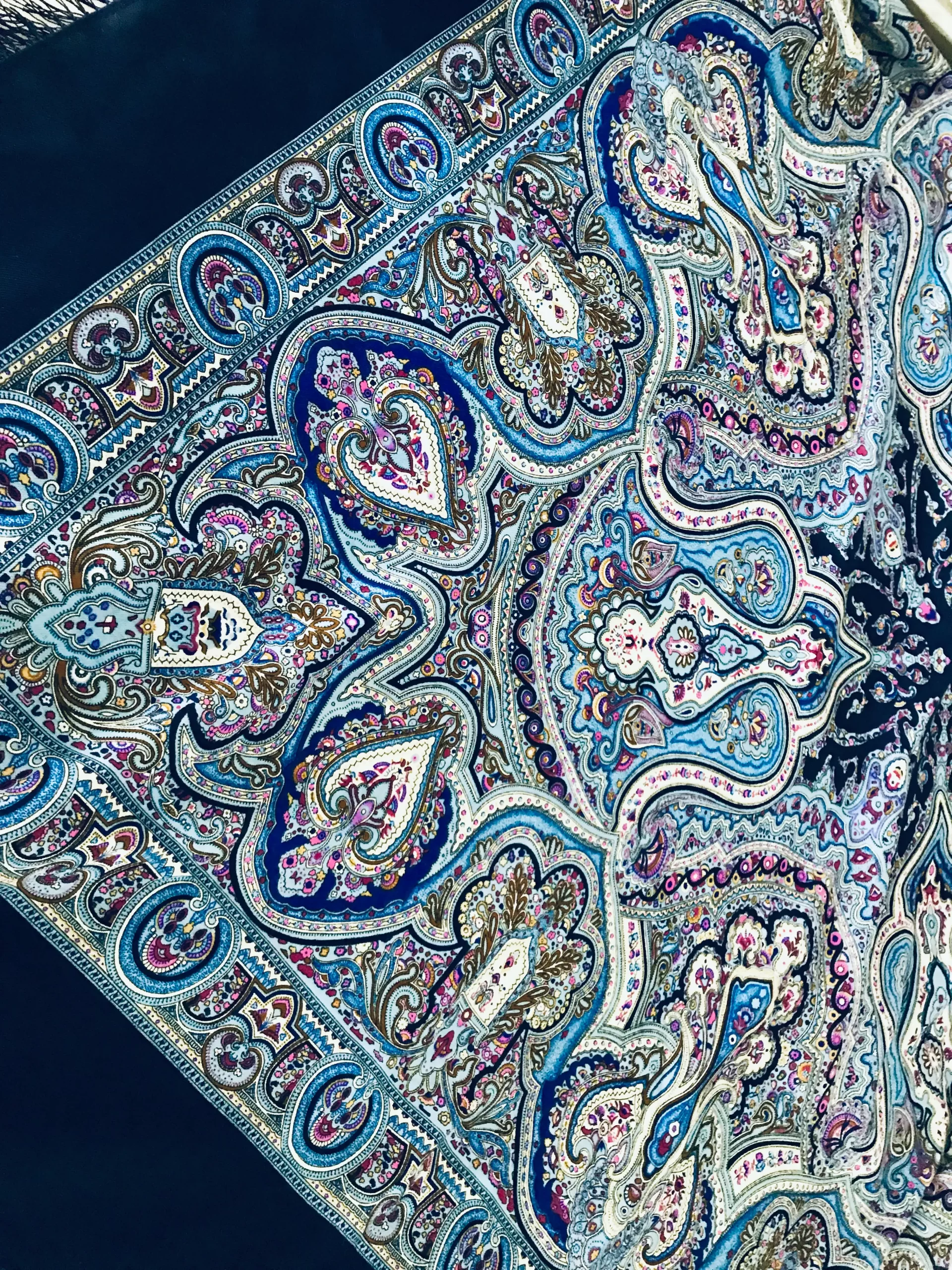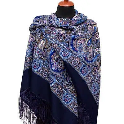 Unbelievable beautiful Pavlovo Posad Blue “Spanish” Large Russian Shawl 100% Wool Pashmina Scarf with silk fringe. 100% Authentic – directly from the factory in Russia. 19th Century design. Reconstructed by Victor Zubritsky.